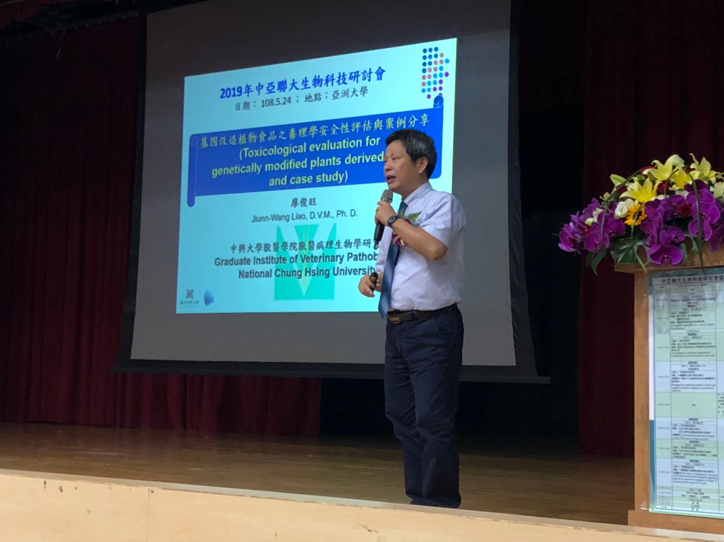 第二场由中兴大学兽医病理生物学研究所所长廖俊旺,他以「基因改造植物食品之毒理学安全性评估与案例分享」为主题演讲。接着有四场的学术专题演讲,分别由四系教师发表个人的专精研究成果,包括中医大生科系助理教授许斐婷、亚大生科系助理教授馀志强等人。