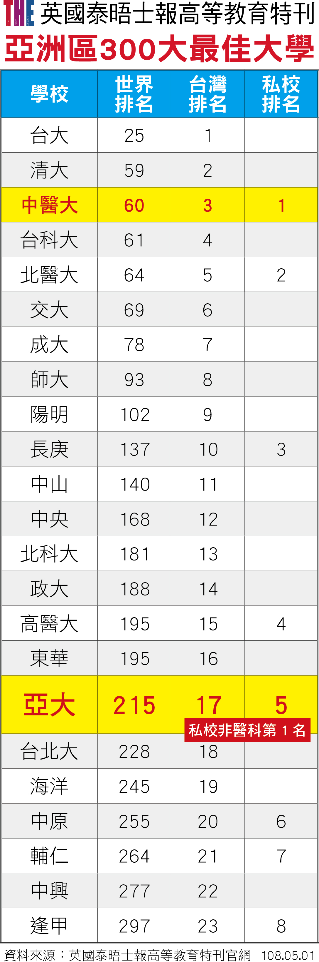 英國泰晤士報官網公布,中醫大今年在亞洲區排第60名、全台第3名,僅次於台大、清大,是私校第1名;亞大在亞洲區第215名、全台第17名、私校第5名,若以台灣非醫學院私校論,亞大為全台私校第1名(見附表)。