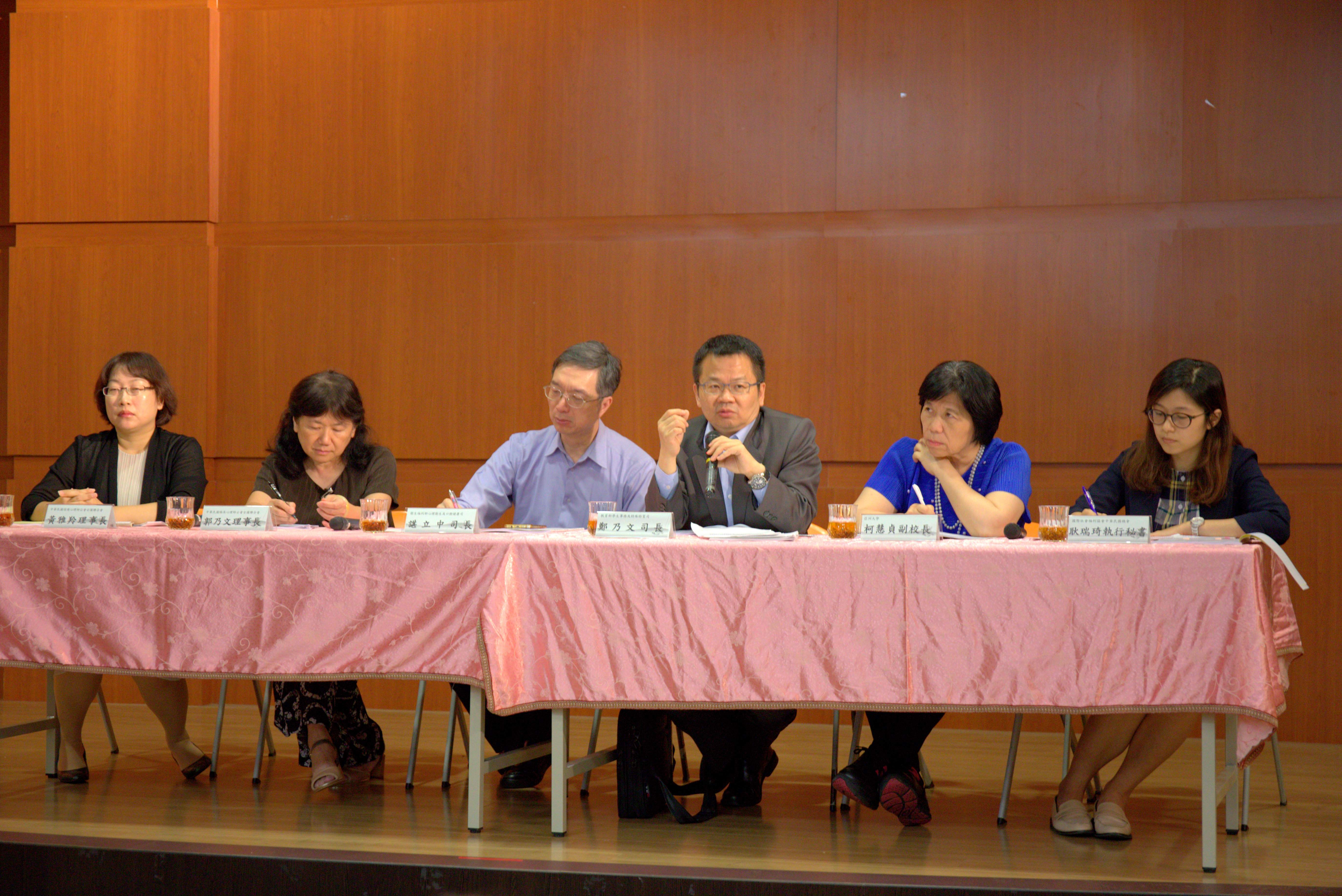 圖說:王作仁理事長主持「網路成癮多元介入模式之整合與共識會議」,與談人員(左起)黃雅羚理事長、郭乃文理事長、諶立中司長、鄭乃文司長、柯慧貞副校長、耿瑞琦執行秘書。 |