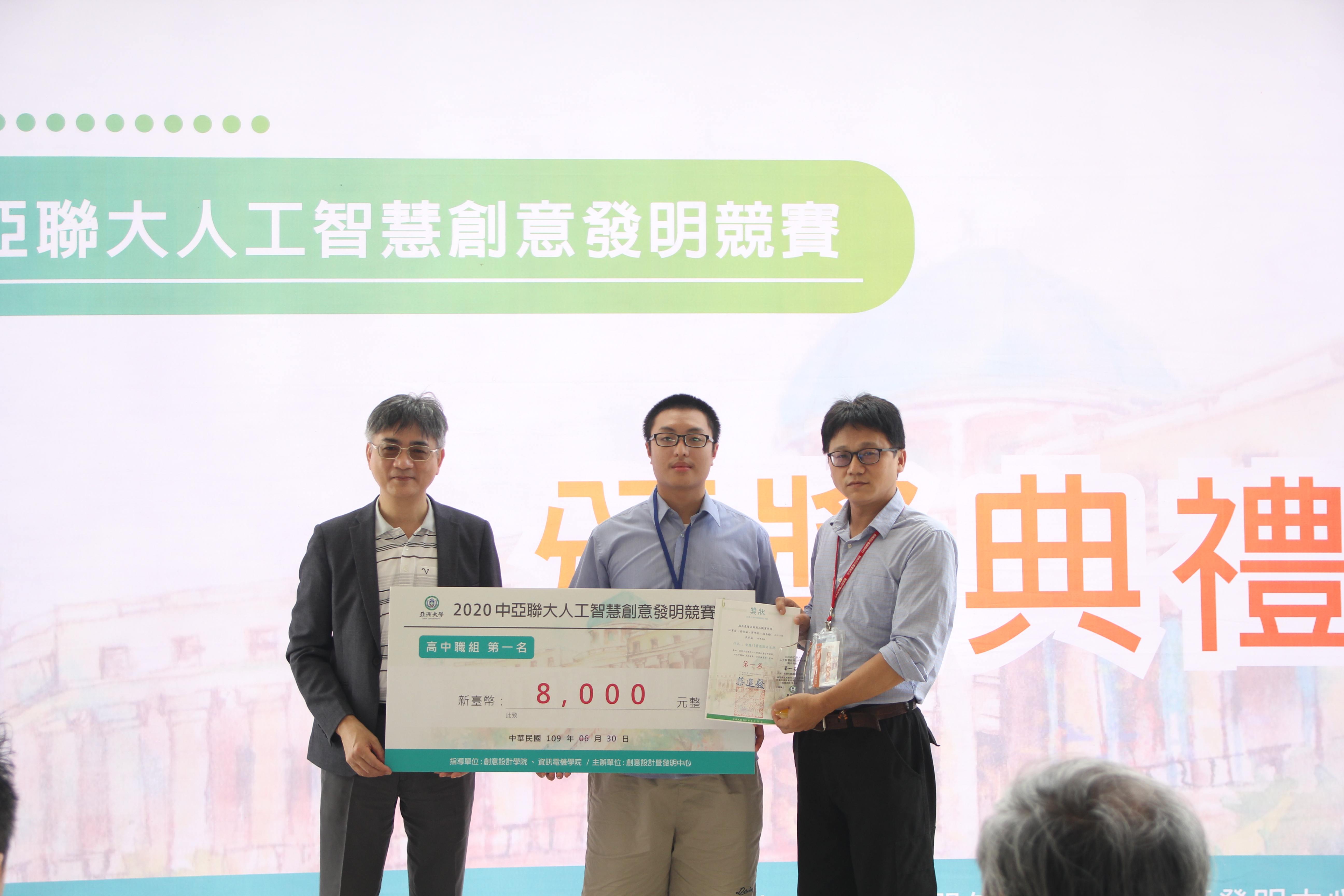 圖說:AI中亞聯大人工智慧創意發明競賽,由曾憲雄副校長(左一)頒發給高中組特優獎項。 |