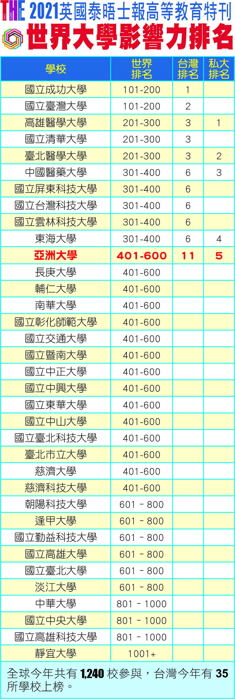 英國泰晤士報高等教育特刊公布2021年「世界大學影響力排名」,亞洲大學(Asia University, Taiwan)名列全球400-600名間、全台並列第11名、私立大學並列第5名、非醫學類私大並列第2名(請見圖表)。亞大在永續發展目標「體面工作和經濟增長」項目全球排名87名,進入前百大,更是全台第一名,顯見亞大相當重視確保學校教職員工的工作權、就業權利與保障性別薪資平等與反歧視措施。